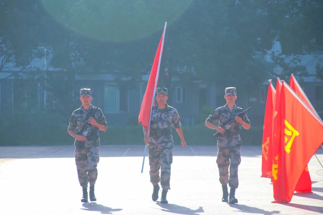 护旗手护卫着军旗,正步行进过主席台前,全体军训学生及教官向军旗敬礼。