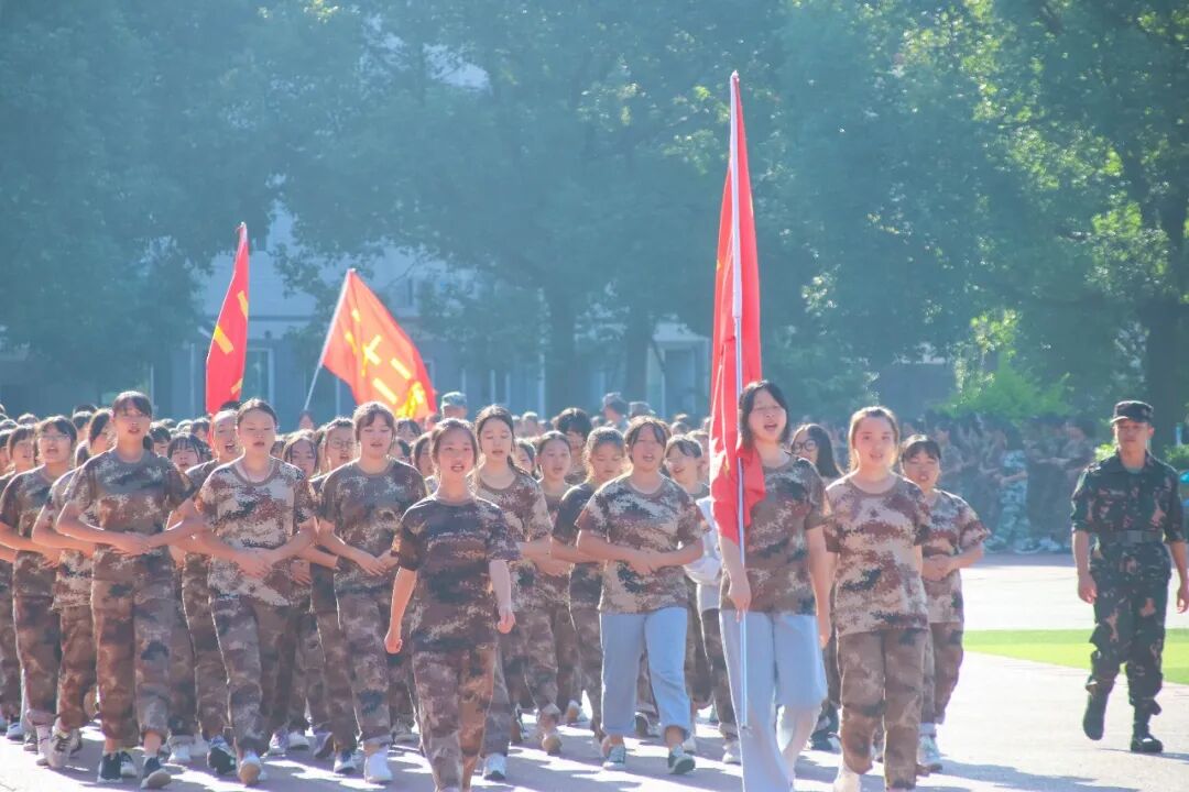 随后,分列式在总教官一声嘹亮的口令中正式开始。三十九个队列方阵踏着整齐划一的步伐、喊着刚劲有力的口号依次经过主席台,同学们经过军训的历练,展示出意气风发、英姿飒爽的风采。