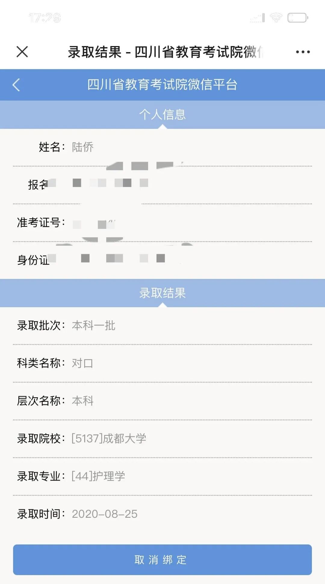 陆侨 一年制高中专班 现已被成都大学护理学专业录取 在这里,我遇到了我的班主任以及各科优秀的老师们,是她们再一次的挽救了我,让我看清了自己的优势,对于我们这种高中毕业的学生来说,语数外都是我们的强项,只是专业知识还比较欠缺,好在老师们都非常的注重基础知识,每个知识点都讲的非常的细,而我跟随着老师的节奏,每个知识点当堂课必须弄懂吃透,遇到问及时请教老师,绝不带着问题过夜。埋头苦学,挑灯夜读,就这样,每次月考,我的成绩都在班上排名靠前,这让我觉得我的努力没有白费,付出总会有收获! 还记得临近高考之际,每天被试卷压得头昏脑胀、精疲力尽时,有几位平时上课就很幽默、搞笑的老师专门来给我们讲笑话,为我们减轻学习的压力,现在想想,真的很感谢背后默默付出的老师们,是你们为我们扬起胜利之帆,助我们驶向成功的彼岸。 现在我的已经被成都大家录取,即将踏入大学校园的我想对和我一样有高考失利经历的同学们说,经历了高考失败的你们,也许还在迷惘和惆怅,但请不要就此放弃,青春是有限的,智慧是无穷的,趁短暂的青春,学习无穷的智慧,要知道不仅仅是为了高考,为了我们的未来,为了人生的辉煌,我们的路途还很遥远。相信自己的个性和胆识,今天的汗水,将会在你的努力下变为鲜艳的花朵,散发出最迷人的气息。请记住,生命的过程是经营人生的过程,不要挥霍生命,也绝不吝惜投入,切勿因一时的困厄而退却,不经历一番寒彻骨,怎得梅花扑鼻香!欢迎大家来乐山市嘉州卫校,相信在学校和老师的培养下,你们也可以和我一样,圆梦大学,圆梦本科!