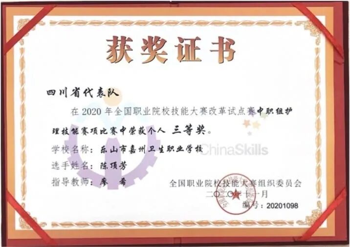 参加本次比赛的选手均由各省市经过层层选拔产生,乐山市嘉州卫生职业学校的陈顶芳同学作为四川省唯一代表参加国赛,沉着冷静,发挥出较高的水准,最终获得2020年全国职业院校技能大赛改革试点赛中职组护理技能赛项三等奖!